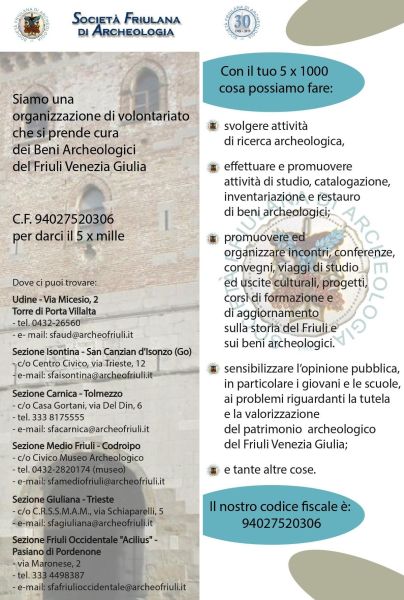 5 x Mille per la Società Friulana di Archeologia Pubblicato il 1 Marzo 2019 1 Marzo 2019 in Bacheca 0 Mi Piace Condividi Dona il 5 x Mille alla Società Friulana di Archeologia. Come, vedi allegato: SFA 5 x mille pdf Previous Post ANNO XXIII – N. 1 – Marzo 2019 Next Post ARCHEOINSIEME-FVG 2.0. Presentazione a Forgaria nel Friuli.