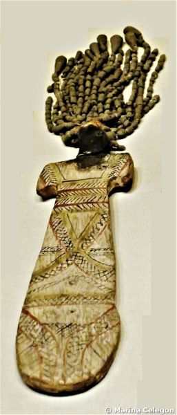 Questo insolito oggetto riproduce una figura femminile estremamente stilizzata realizzata in legno a forma di pagaia, da cui il nomignolo di “bambola a pagaia”. Ha la testa in fango modellata grossolanamente, con perline al posto degli occhi. La folta chioma, dagli egizi associata alla seduzione, è realizzata con fili in cui sono infilate perline di fango. Il corpo, dalle braccia appena accennate e senza gambe, è decorato con una veste colorata che lascia visibili il pube.