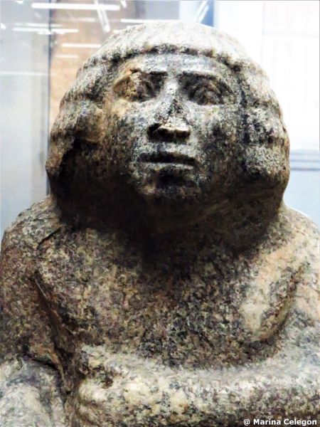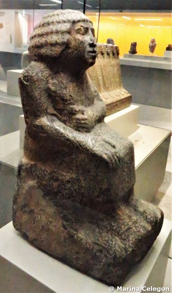 La collezione egizia di Napoli si formò all’inizio dell’Ottocento e, molti reperti provengono dalla collezione privata dei Borgia, com’è il caso della c.d. “Dama di Napoli”, il reperto più antico dell’intera collezione. Per la lunga gonna venne a lungo definita una “Dama”, anche se non particolarmente attraente. In realtà la statua rappresenta un funzionario della III dinastia (circa 2700-2630 a.C.), seduto su un seggio cubico. Sono tipicamente maschili tanto la parrucca a casco che la lunga gonna fermata in vita. E’ questo l’abbigliamento tipico dei funzionari dell’Antico regno.