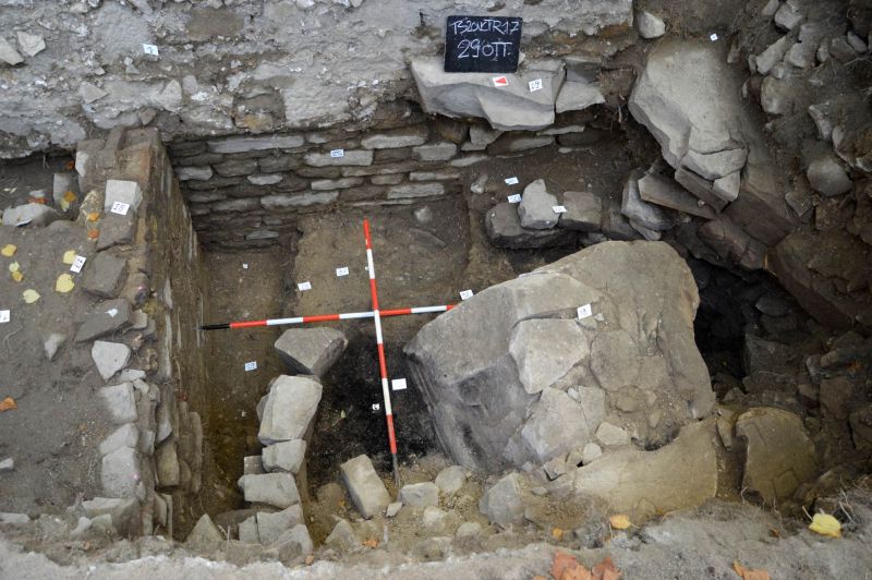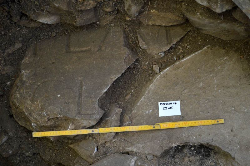 Una volta abbandonato, subito prima della costruzione del grande muro, il silos è stato riempito da frammenti architettonici e da un enorme blocco di pietra squadrato, con cornici scolpite, che riporta tracce di un’iscrizione.